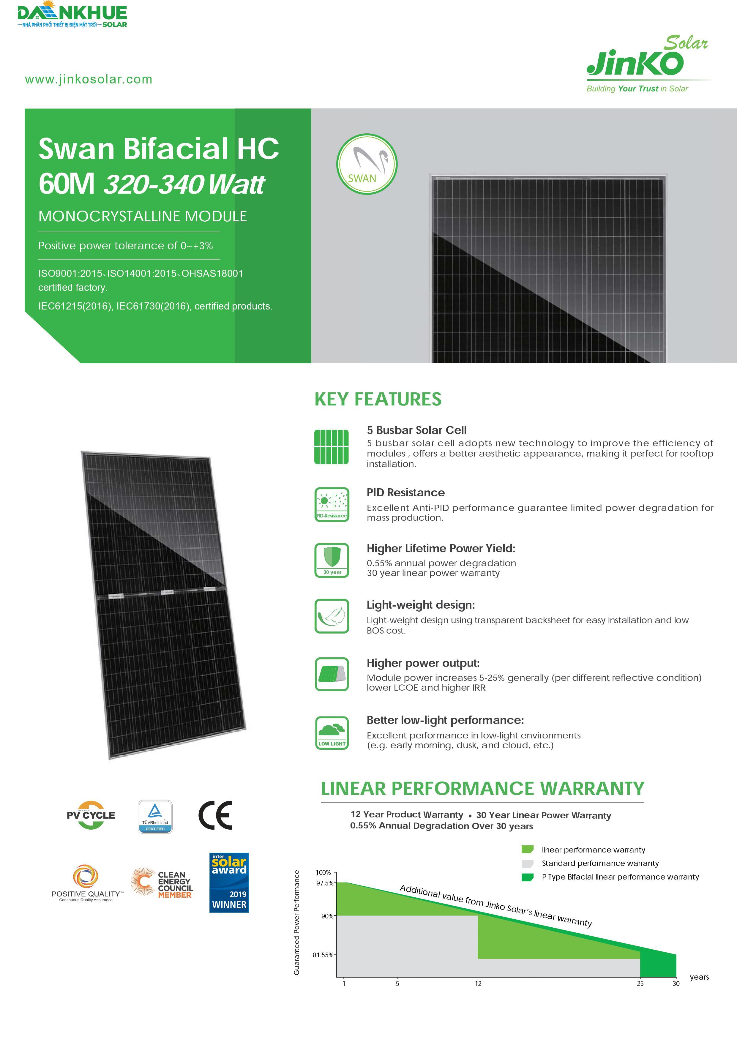 Với công suất từ 320 đến 340W, Tấm pin năng lượng mặt trời Jinko Swan Bifacial HC 60M cung cấp khả năng sản xuất năng lượng liên tục và an toàn cho hệ thống năng lượng mặt trời.