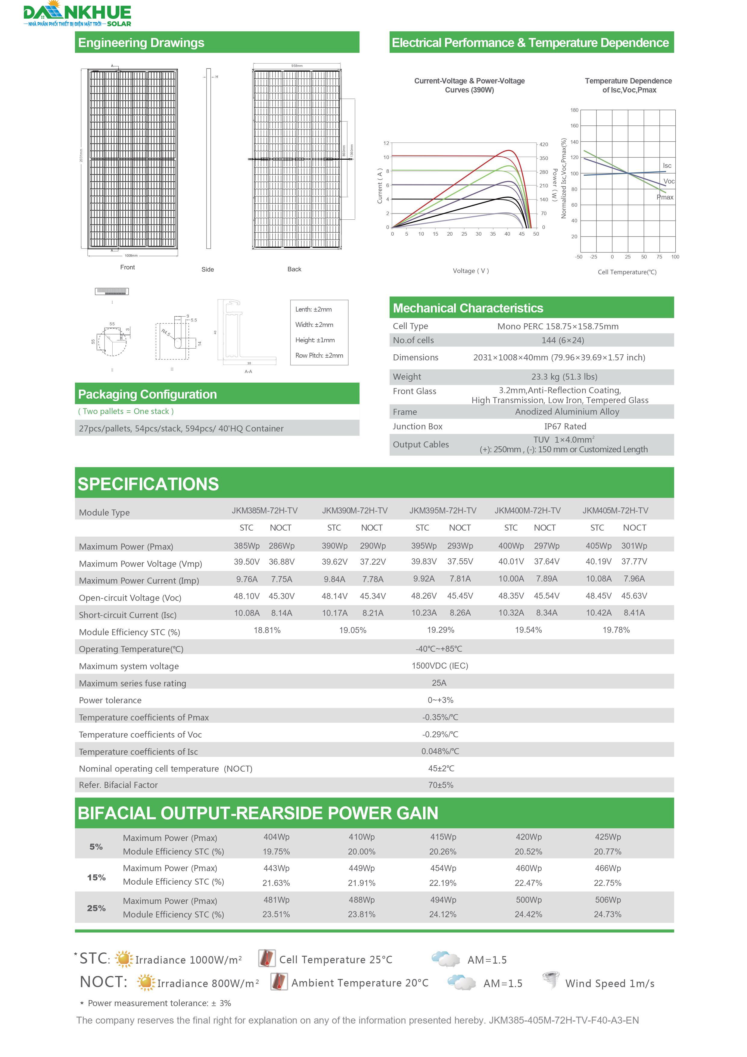 Loại Model: JKM385M-72H-TV JKM390M-72H-TV JKM395M-72H-TV JKM400M-72H-TV JKM405M-72H-TV